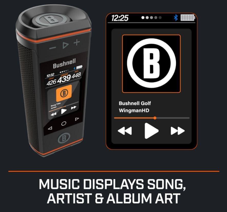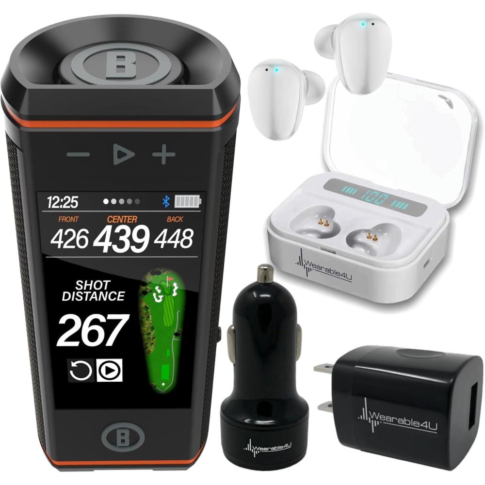 Bushnell Wingman HD View Golf Speaker, 3.5″ Touchscreen, GPS Distances, Premium 360° Audio, Waterproof Design, Magnetic Cart Mount with Wearable4U Black Earbuds & Car/Wall Chargers Bundle(+WHT EarBuds & CarWall Adapters)