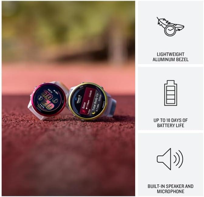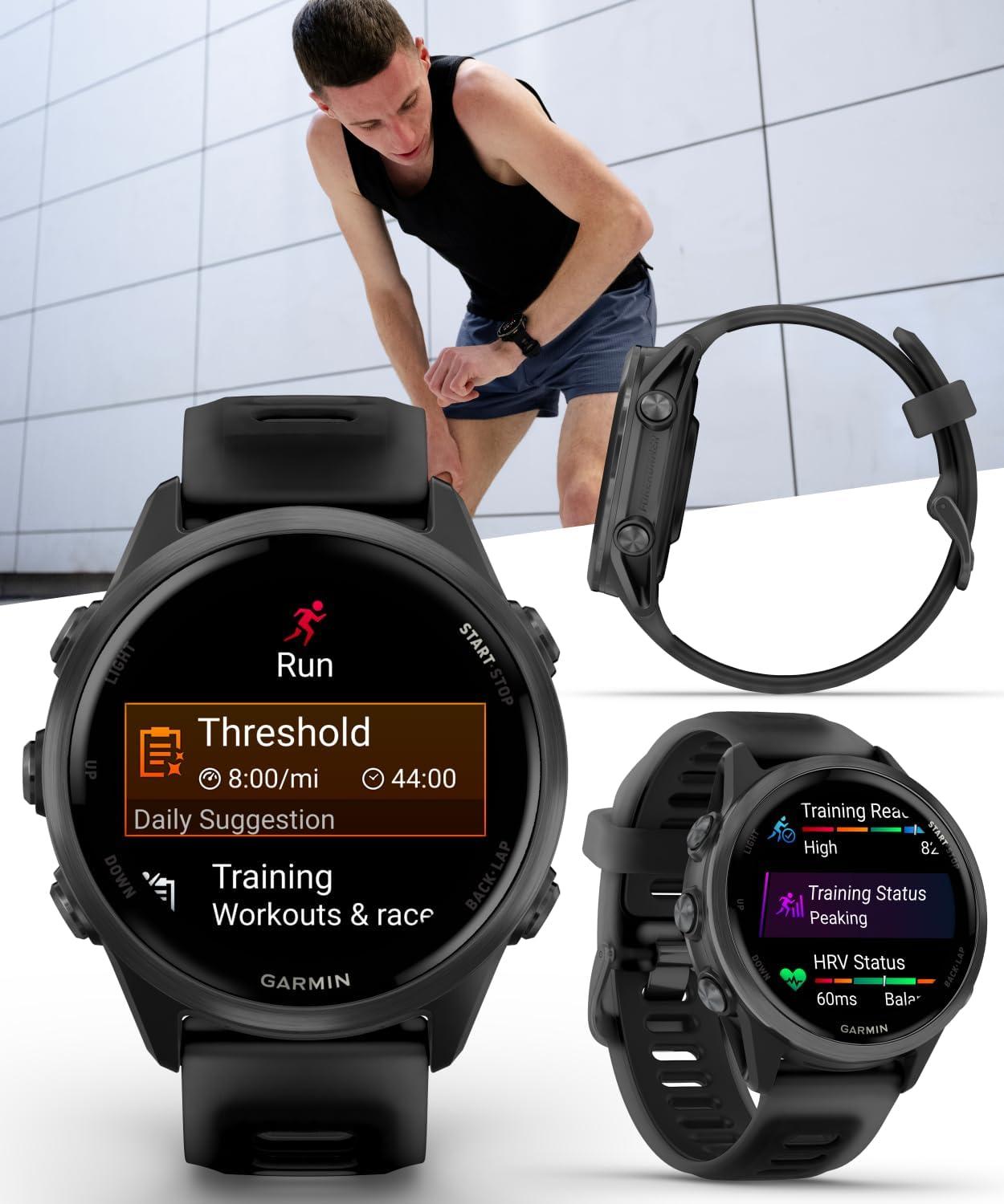 Up to 11 days of battery life in smartwatch mode and up to 18 hours in GPS mode for a more complete picture of your training and recovery. Train for an event, achieve a milestone, or improve your fitness with Garmin Coach training plans; these running and triathlon plans are personalized to you and adapt based on your performance and recovery