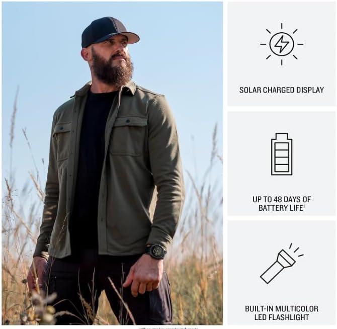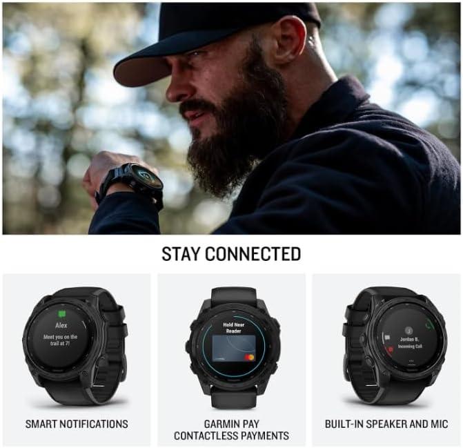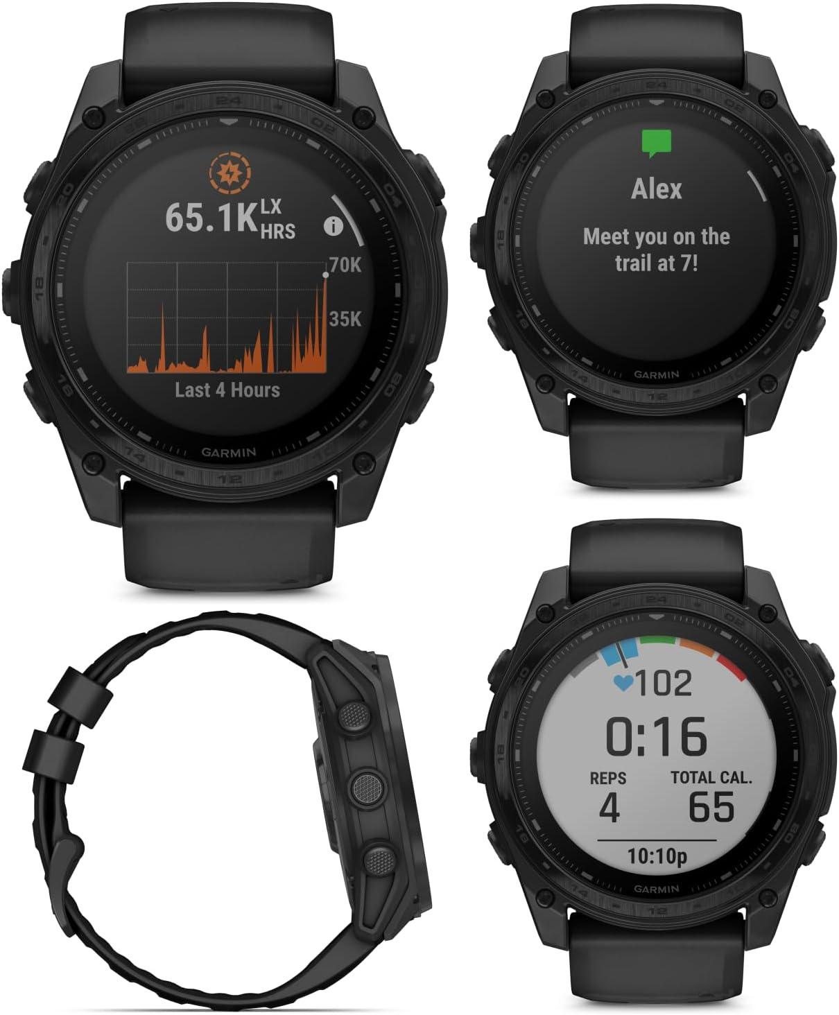 Advanced tactical GPS smartwatch features a 1.4” solar charged display, titanium bezel and sapphire lens and built-in LED flashlight for after-dark visibility