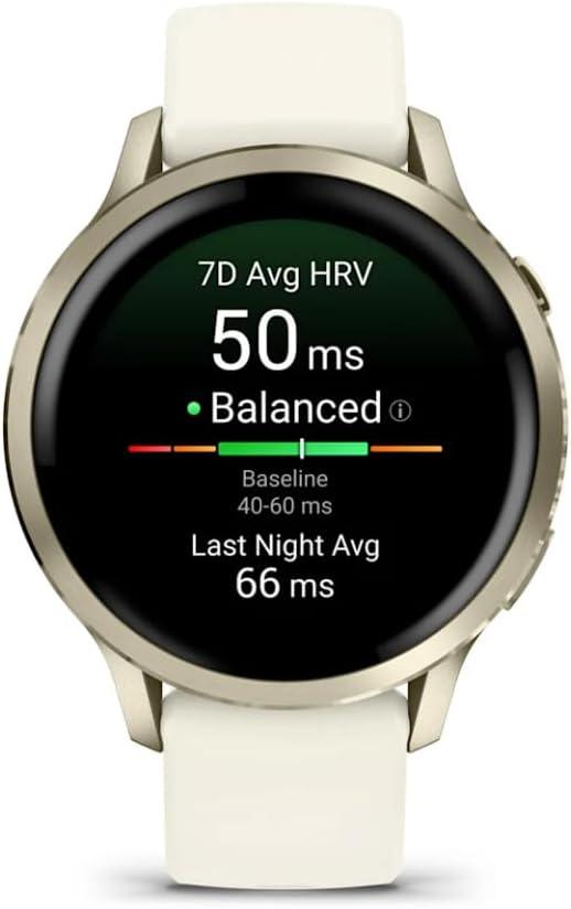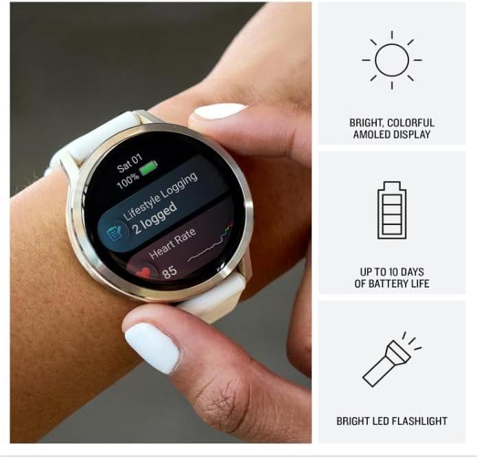 imageGarmin Venu 4 41mm AMOLED Advanced Health ampamp Fitness GPS Smartwatch Bright ampamp Colorful Display Builtin Flashlight Up to 10 Days Slate with Black Silicone Band wWearable4U White Earbuds BundleLunar GoldBone