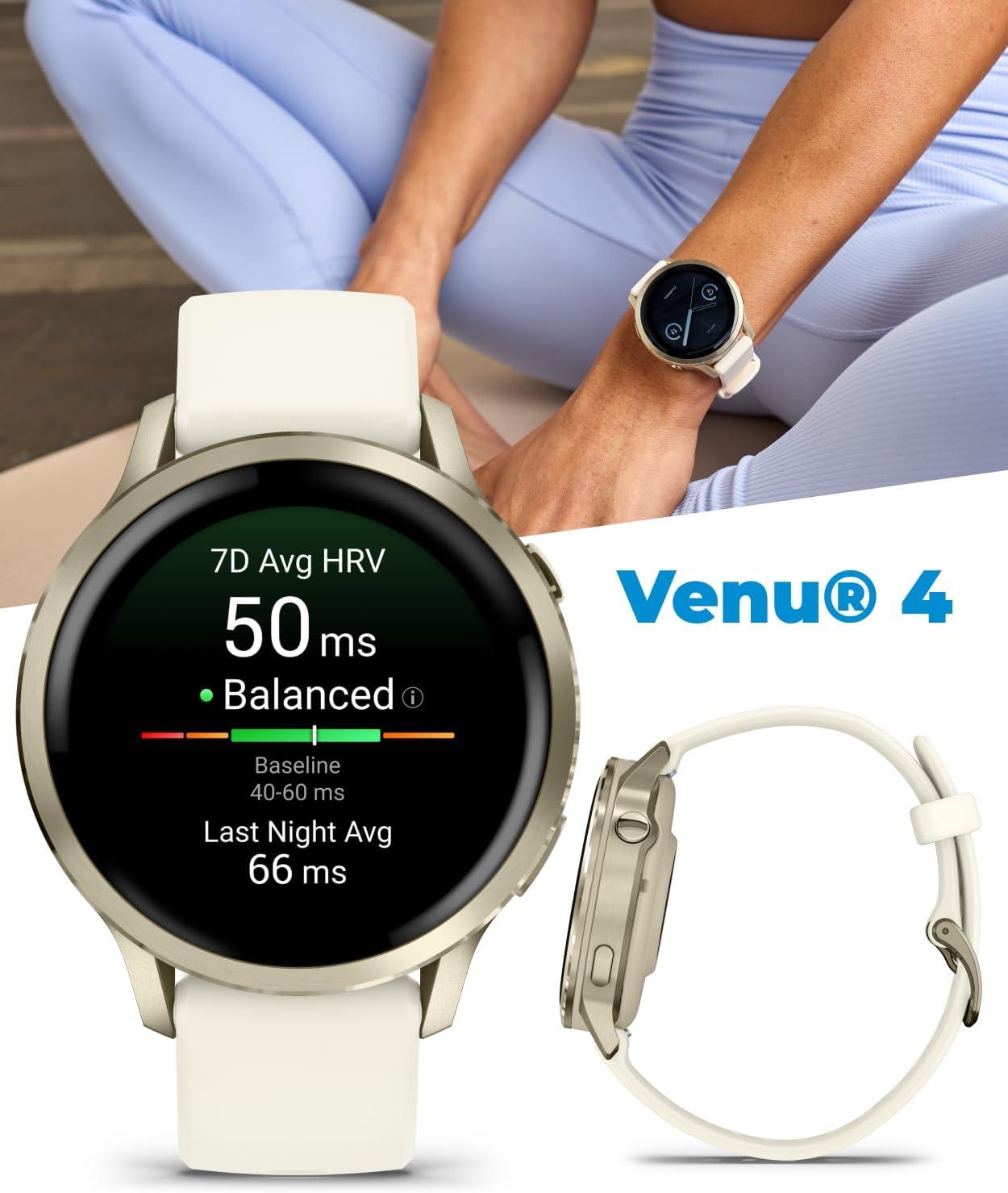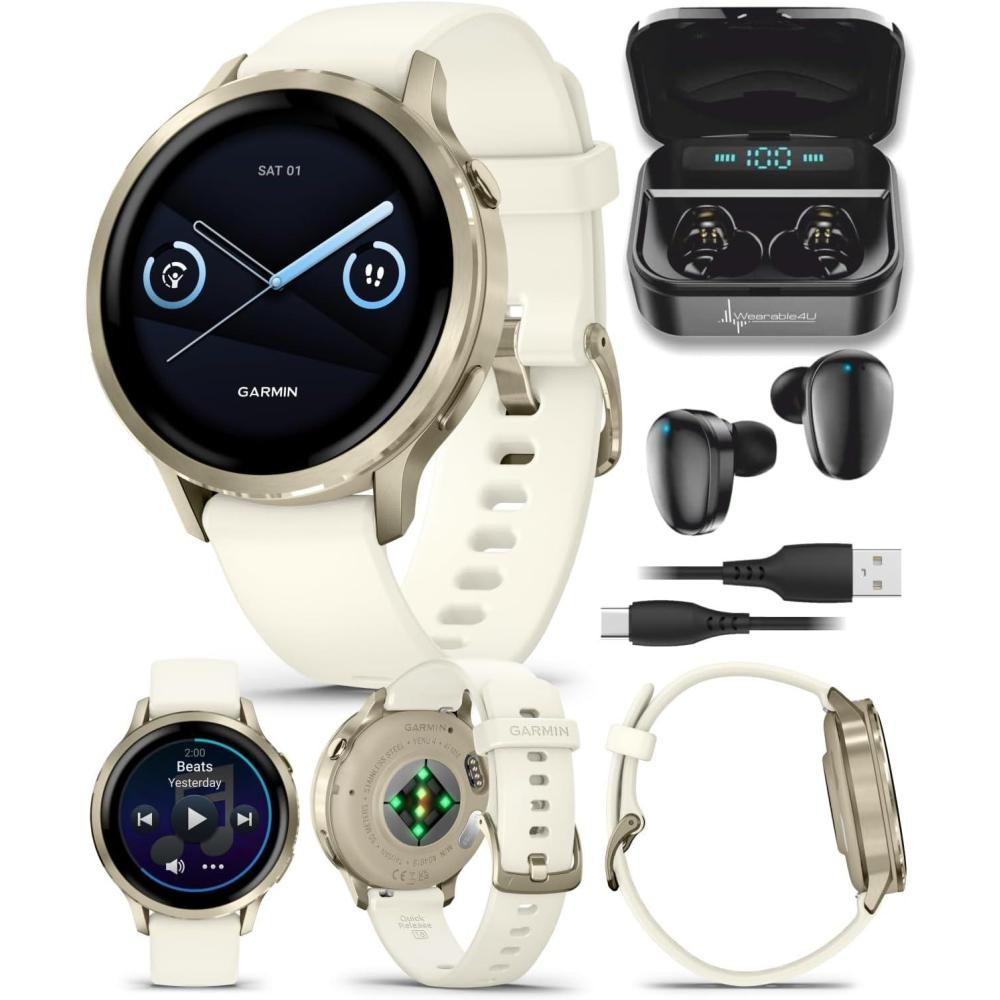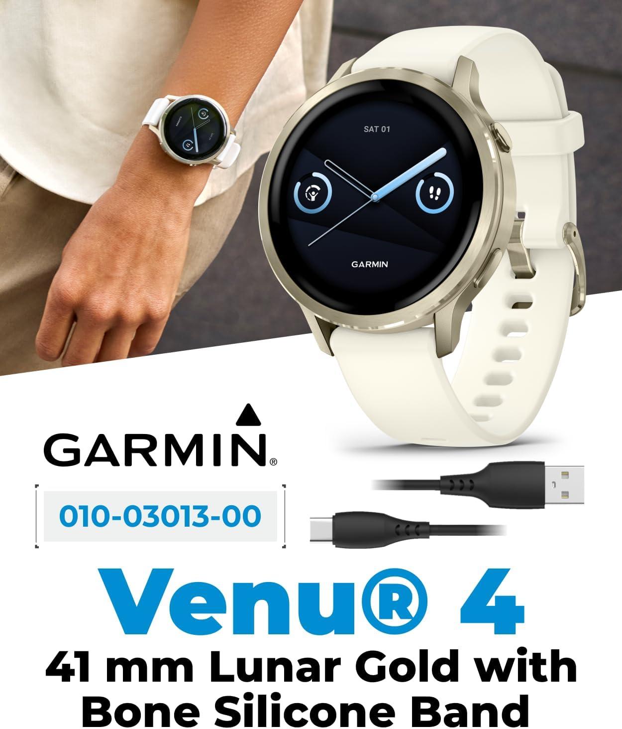 Garmin Venu 4 41mm AMOLED Advanced Health & Fitness GPS Smartwatch, Bright & Colorful Display, Built-in Flashlight, Up to 10 Days, Slate with Black Silicone Band w/Wearable4U White Earbuds Bundle(Lunar Gold/Bone)