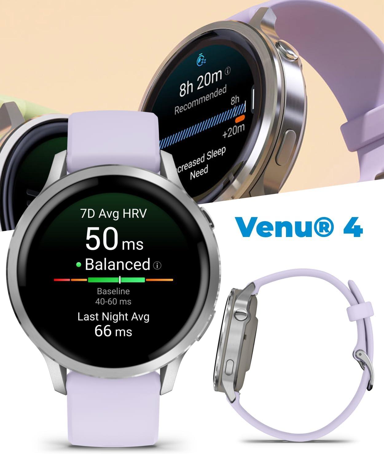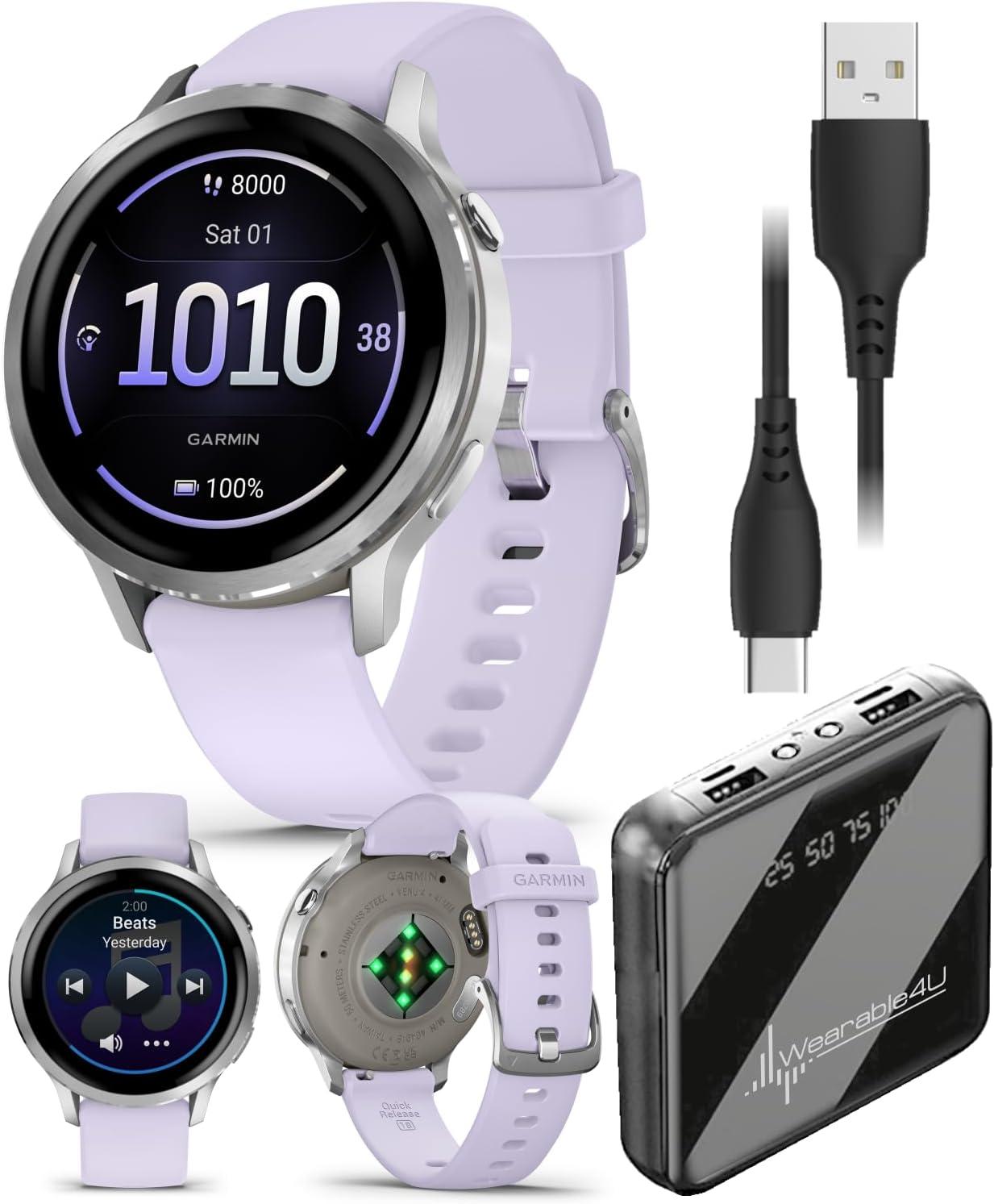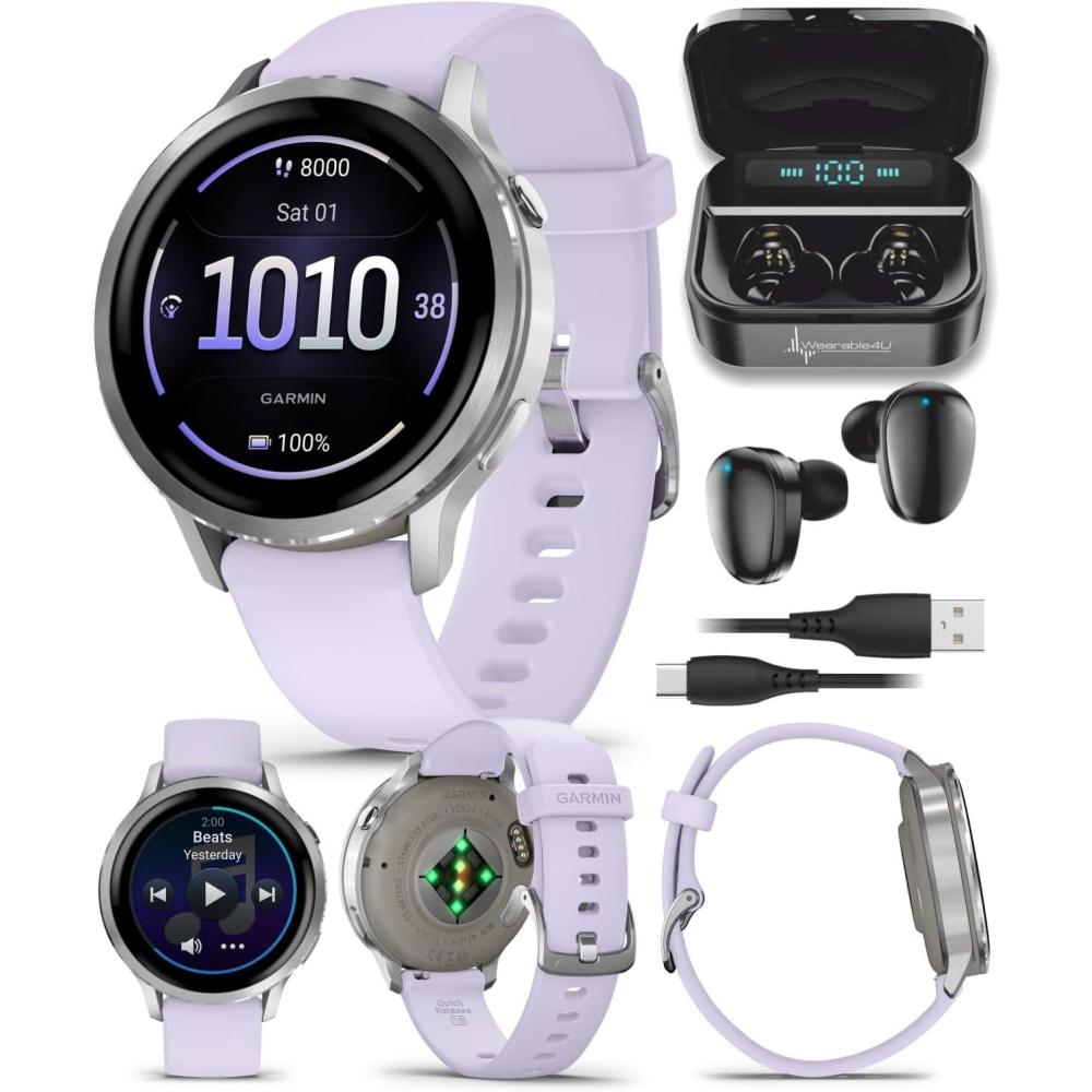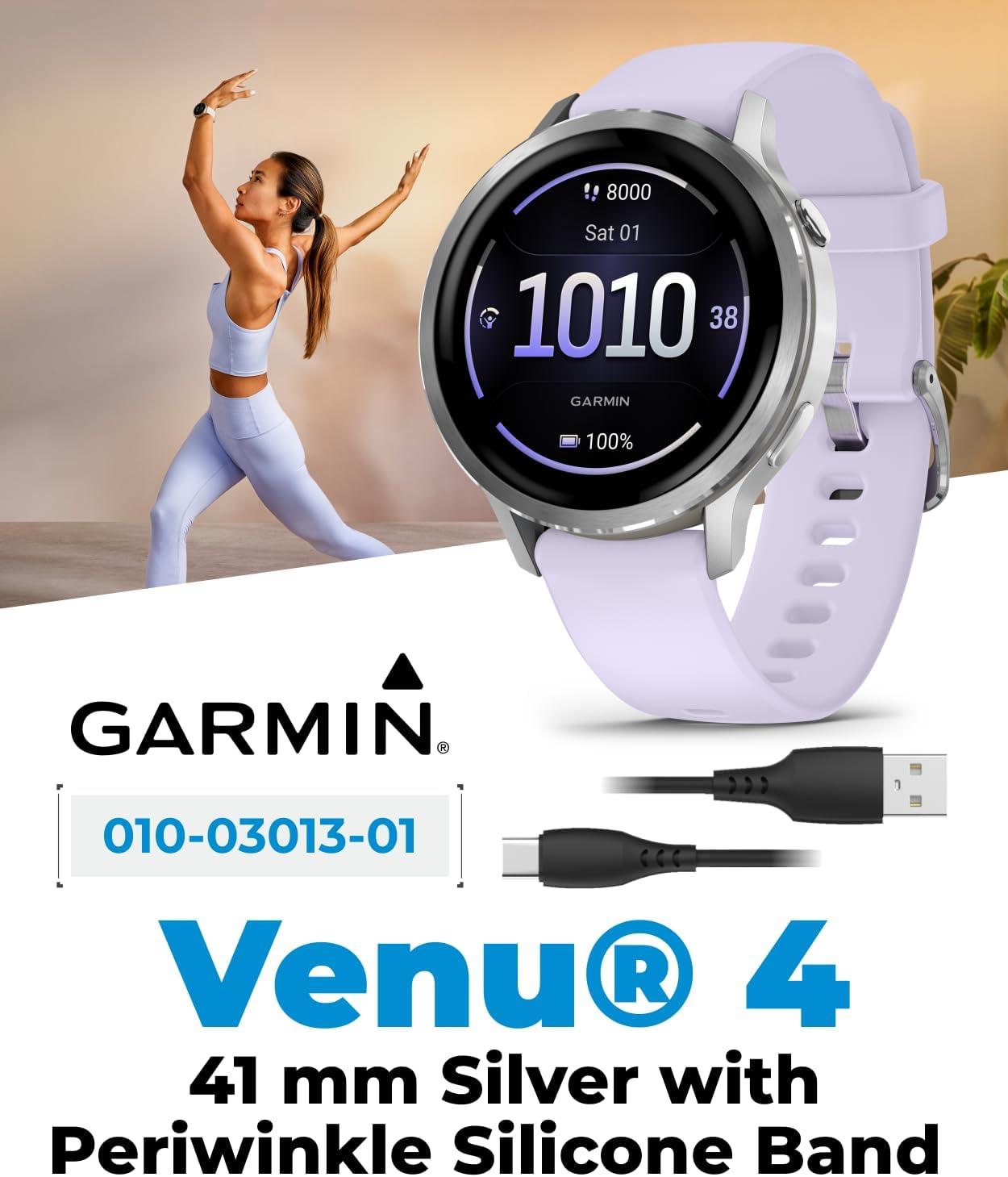 Garmin Venu 4 41mm AMOLED Advanced Health & Fitness GPS Smartwatch, Bright & Colorful Display, Built-in Flashlight, Up to 10 Days, Slate with Black Silicone Band w/Wearable4U White Earbuds Bundle(Silver/Periwinkle)