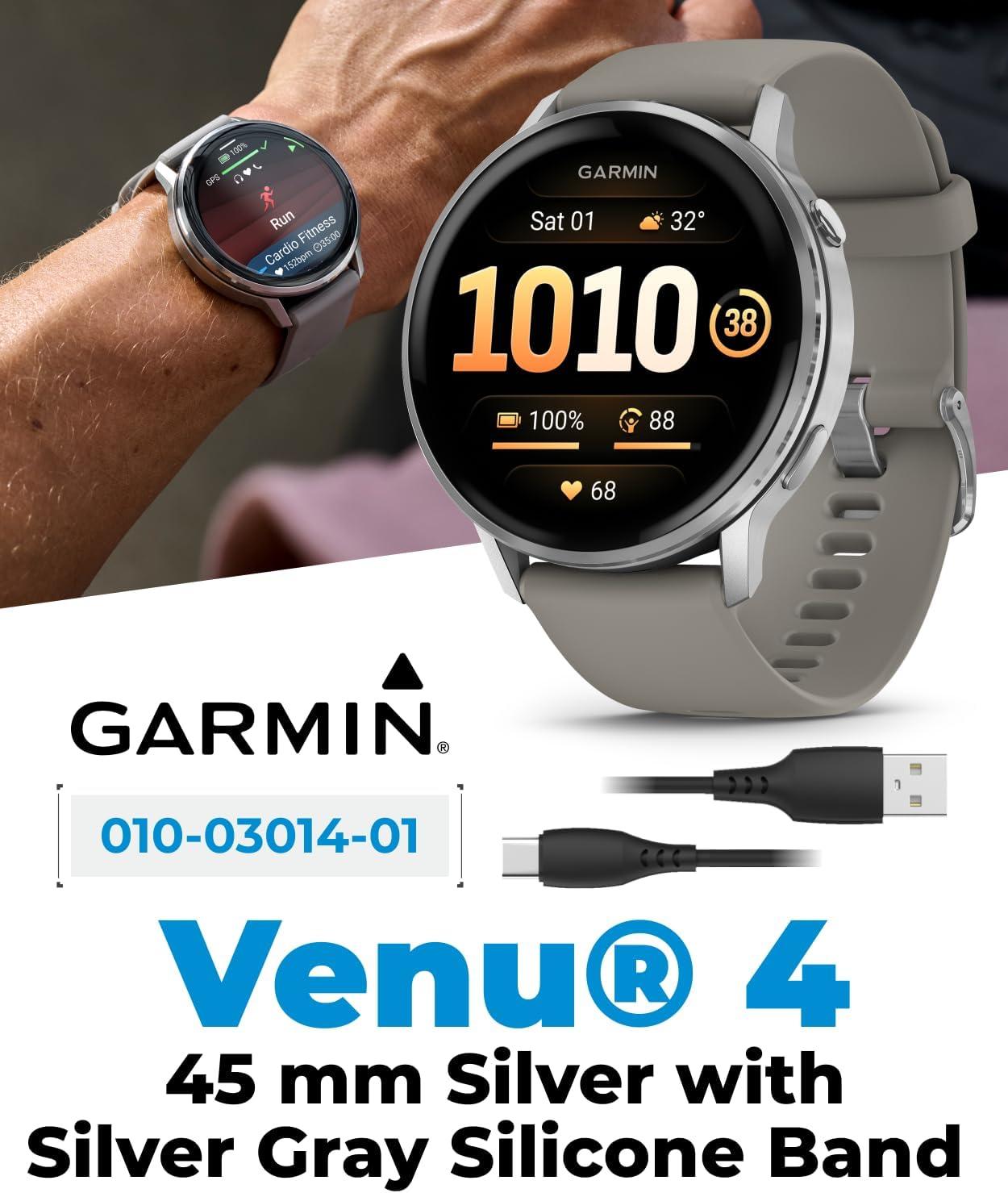 Garmin Venu 4 45mm AMOLED Advanced Health & Fitness GPS Smartwatch, Bright & Colorful Display, Built-in Flashlight, Up to 12 Days Silver w/Silver Gray Silicone Band w/Wearable4U Black Earbuds Bundle(Silver/Gray)