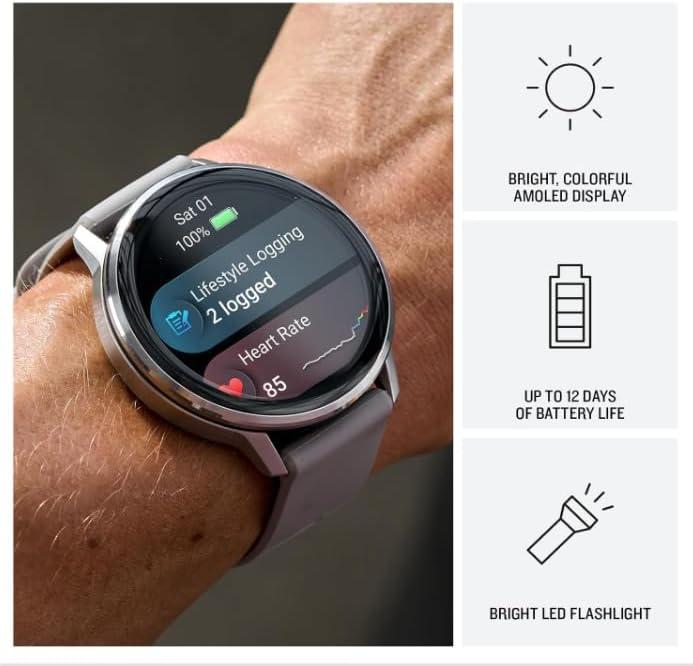 Smartwatch with a bright, colorful display, stainless steel design, and built-in flashlight; up to 12 days of battery life gives a more complete picture of your health
