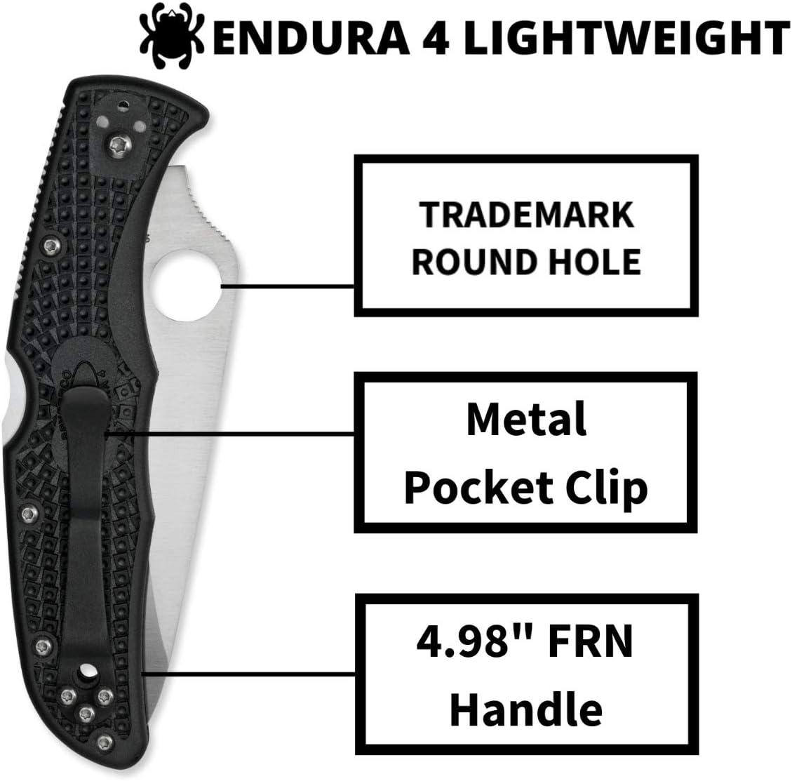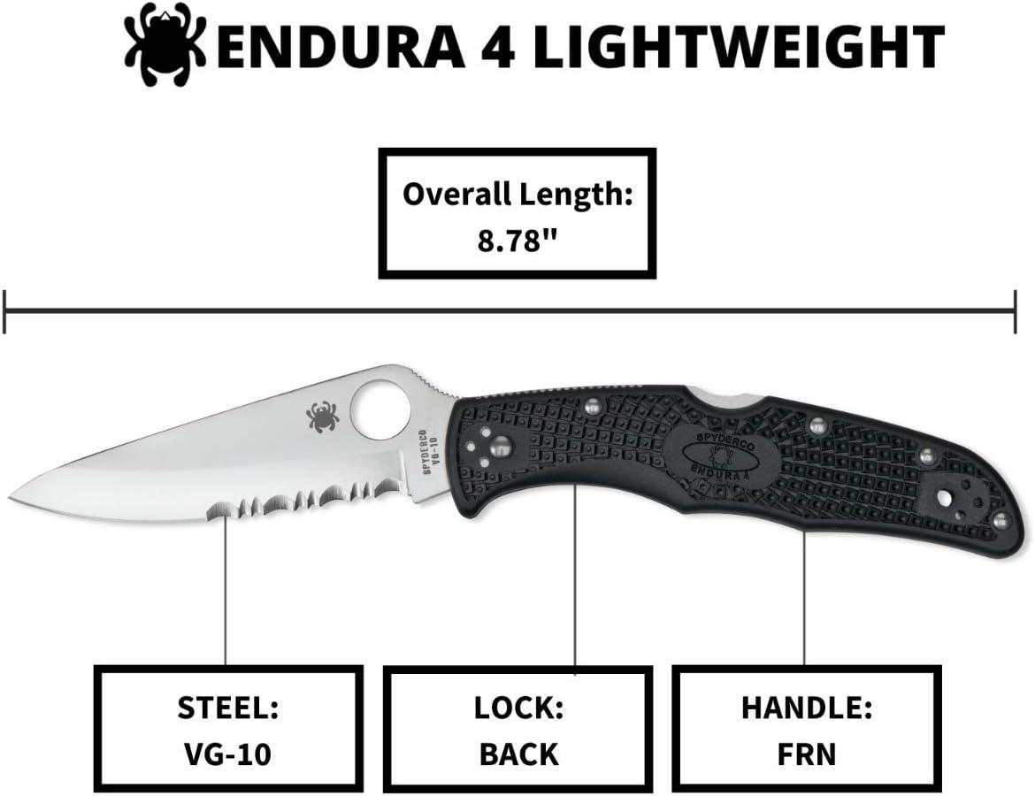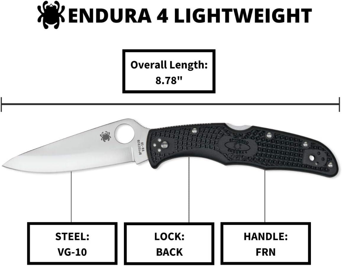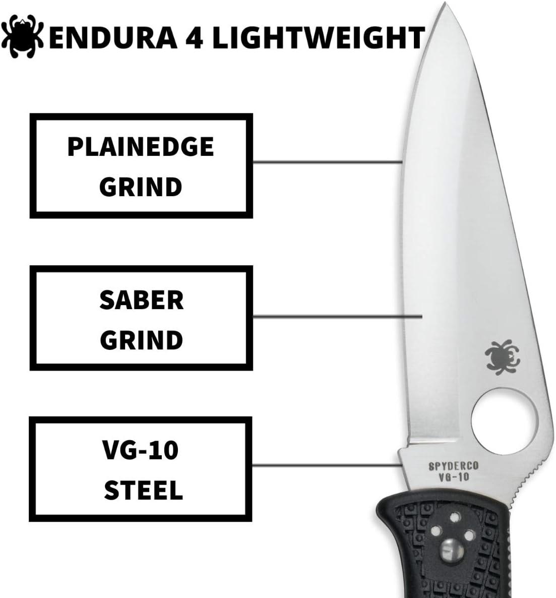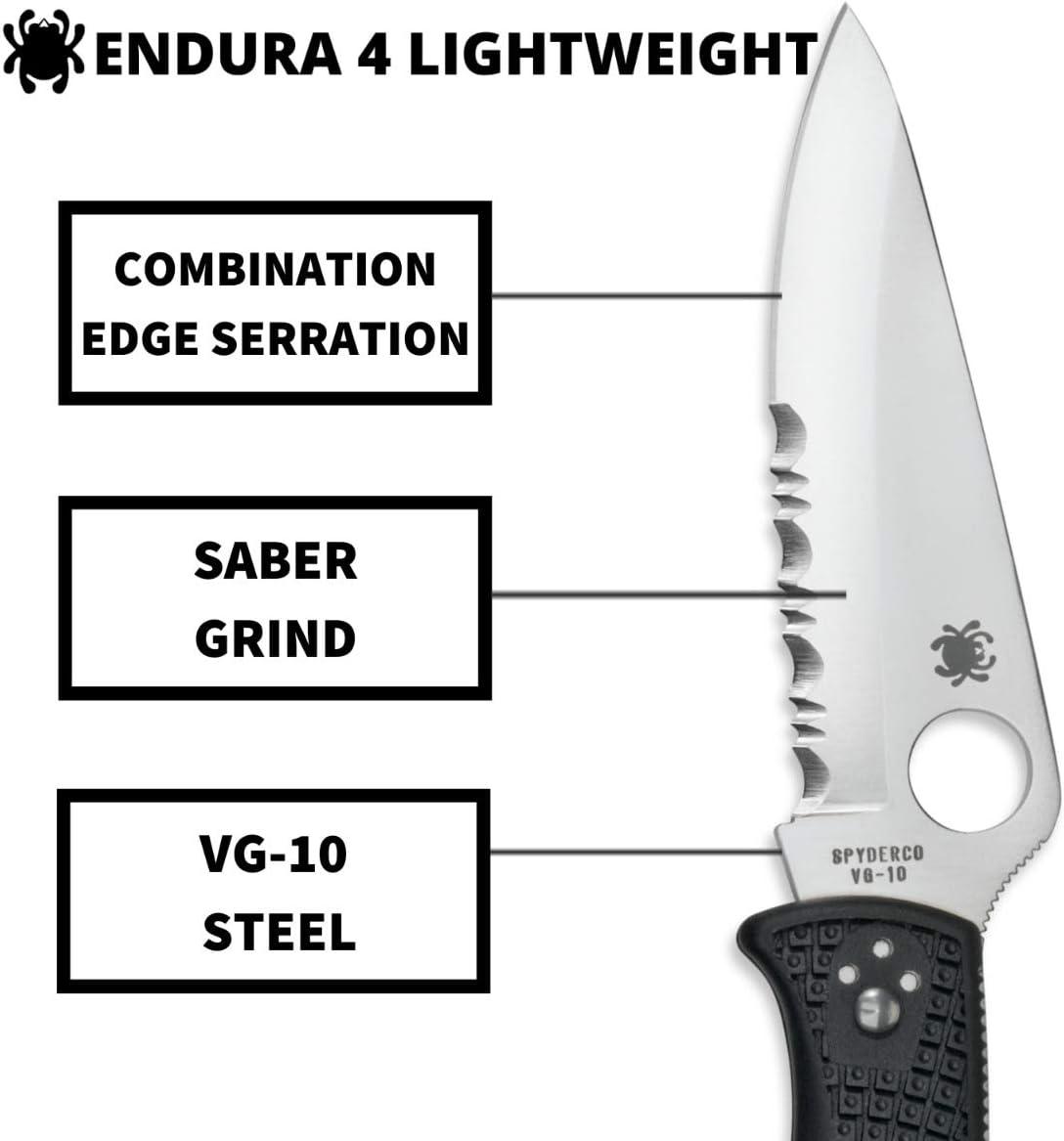 Spyderco Endura 4 Folding Pocket Knife with 3.8″ VG-10 Steel Blade and FRN Handle – EDC Knife for Men and Women, Perfect for Hunting, Tactical, Camping, Survival, Hiking – CombinationEdge – C10PSFG(Black Handle – Stainless Steel Blade)