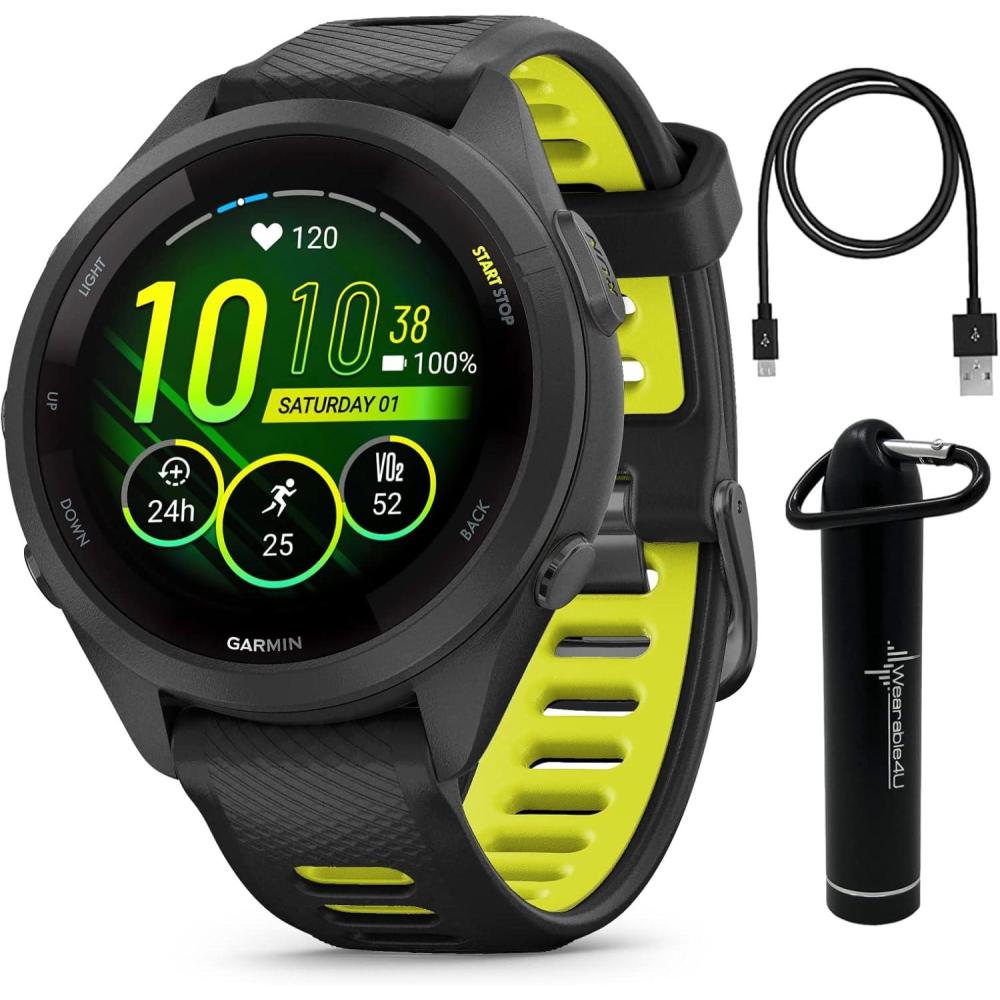 IN THE BOX: 1x Garmin Forerunner 265S GPS Running Smartwatch, Black, 1x charging/data cable, 1x Wearable4U E-Bank (wa001), 1x microUSB cable