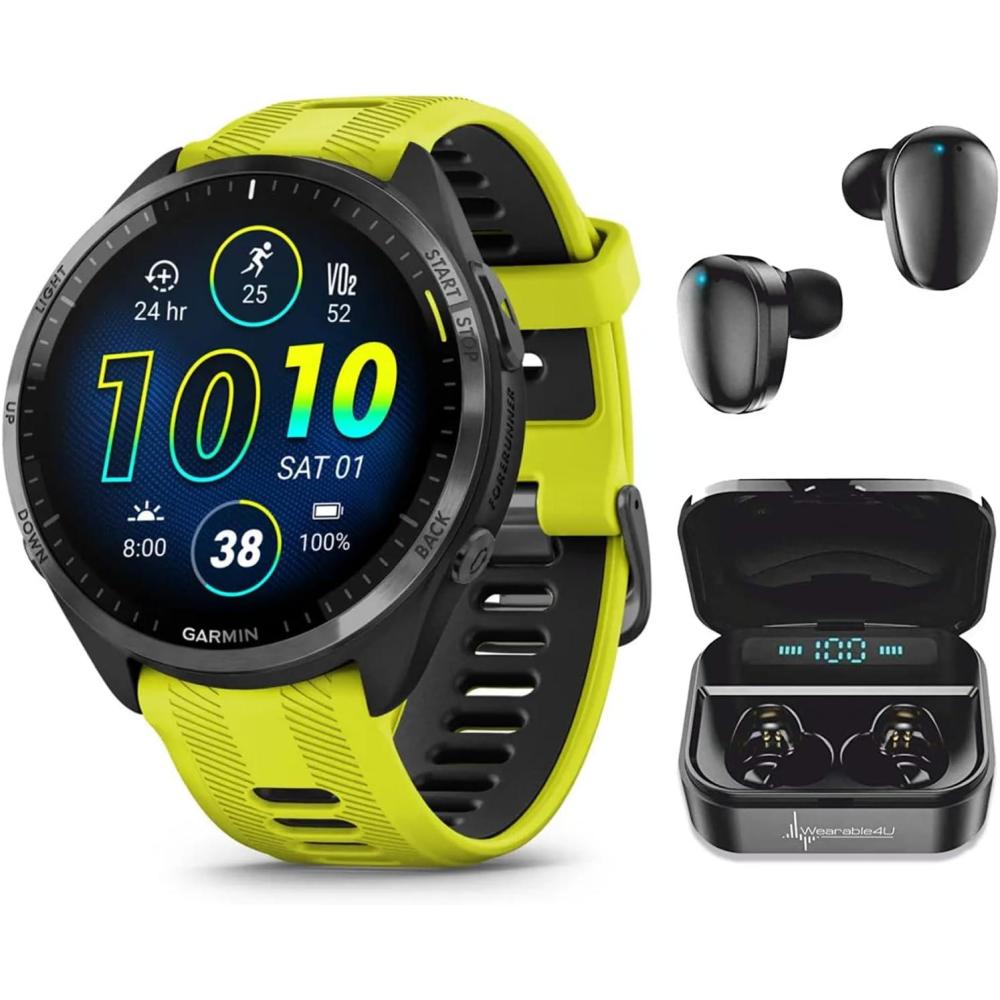 IN THE BOX: 1x Garmin Forerunner 965 GPS Running Smartwatch, Carbon Gray DLC Titanium Bezel with Black Case and Amp Yellow/Black Silicone Band, 1x charging/data cable, 1x Wearable4U Black Earbuds (TWS X7/X7-1), 1x microUSB cable