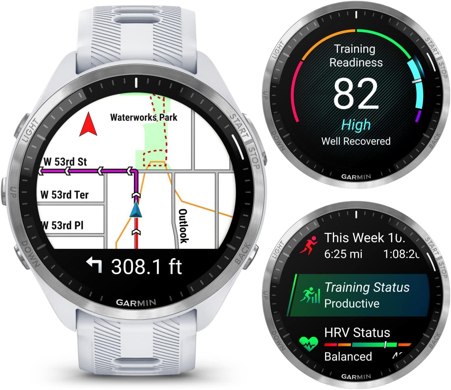 PLAN FOR THE PODIUM: Plan race strategy with personalized daily suggested workouts based on the race and course that you input into the Garmin Connect app and then view the race widget on your watch; daily suggested workouts adapt after every run to match performance and recovery. As soon as you wake up, get your morning report with an overview of sleep, recovery and training outlook alongside HRV status, training readiness and weather.