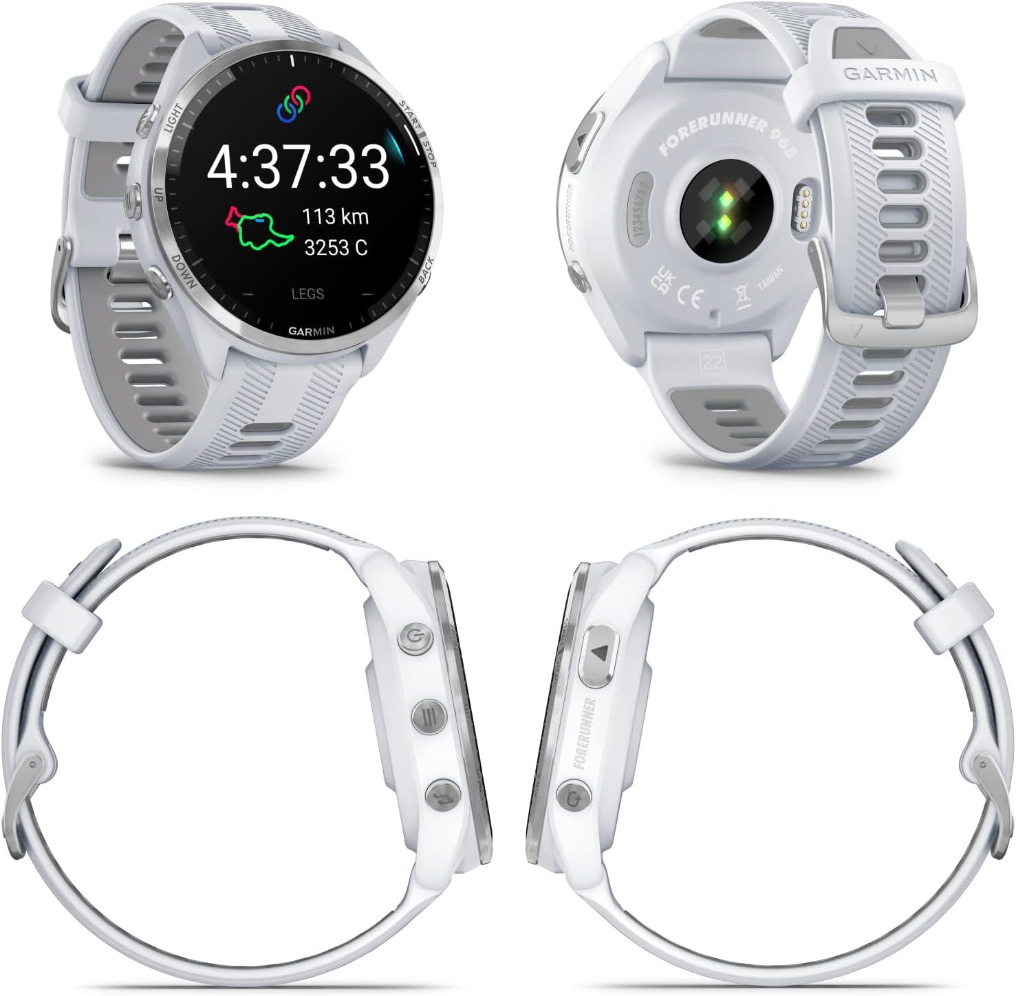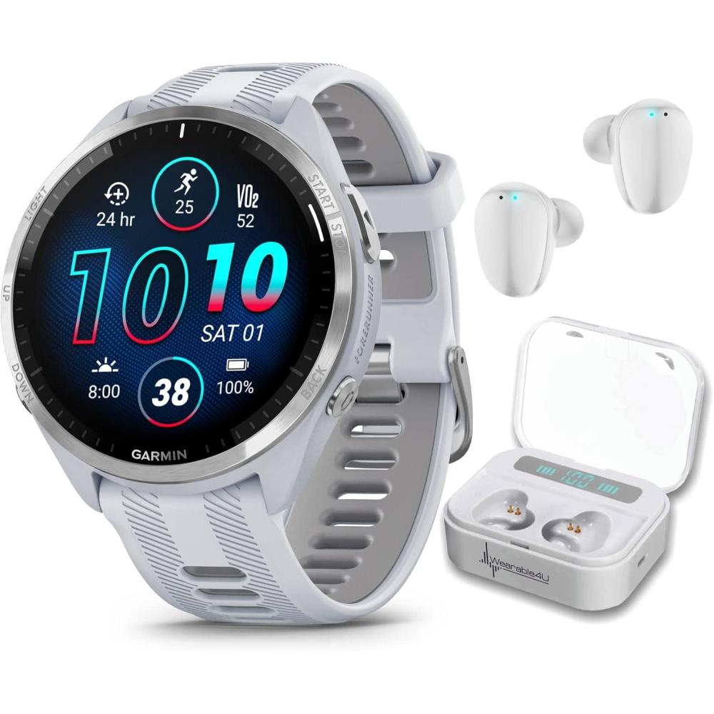 IN THE BOX: 1x Garmin Forerunner 965 GPS Running Smartwatch, Titanium Bezel with Whitestone Case and Whitestone/Powder Gray Silicone Band, 1x charging/data cable, 1x Wearable4U White Earbuds (TWS X7/X7-1), 1x microUSB cable