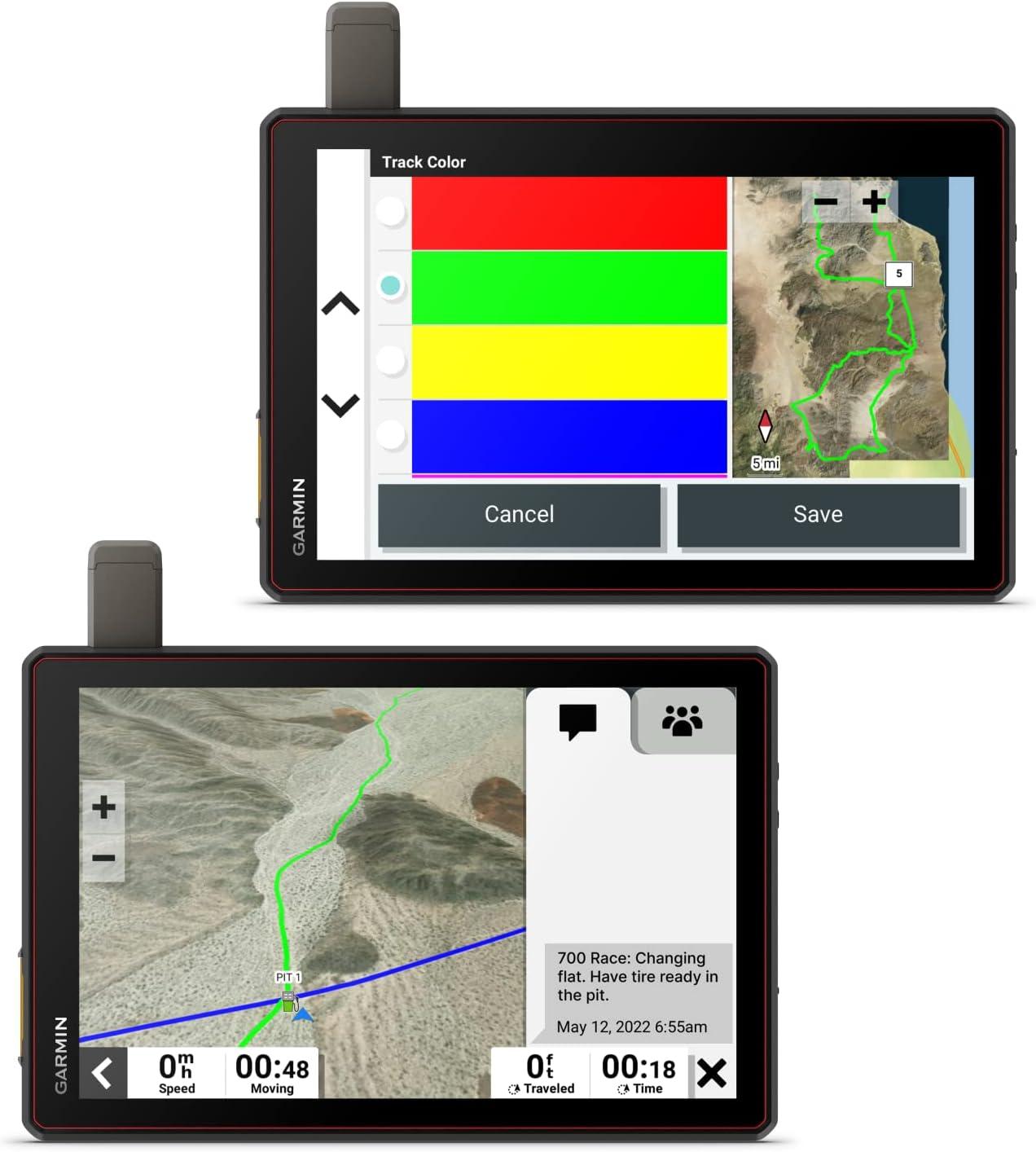 Tread XL – Baja Chase Edition is a rugged, IP67 off-road chase navigator with a large 10” ultrabright touchscreen. Features team tracking with built-in inReach technology (Requires active inReach Flex Team subscription. Some jurisdictions regulate or prohibit the use of satellite communications devices.) allows race vehicles and chase trucks to see the live positions of your race team and message each other with global satellite coverage
