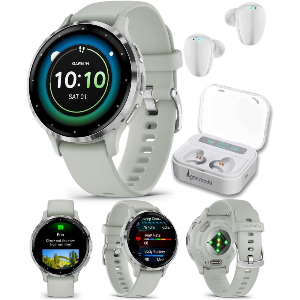 Wearable4U Garmin Venu 3S GPS Smartwatch, AMOLED Display 41 mm Watch, Advanced Health and Fitness Features, Up to 10 Days of Battery, Wheelchair Mode, Sleep Coach, Sage Gray Black Earbuds Bundle(Silver/Whitestone +Black EarBuds)
