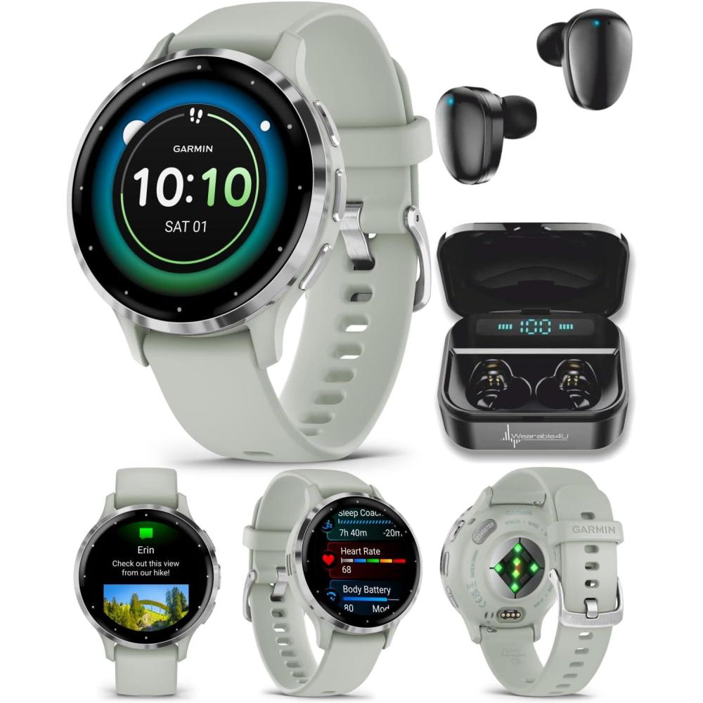 imageWearable4U Garmin Venu 3S GPS Smartwatch AMOLED Display 41 mm Watch Advanced Health and Fitness Features Up to 10 Days of Battery Wheelchair Mode Sleep Coach Sage Gray Black Earbuds BundleSilverSage Gray White EarBuds