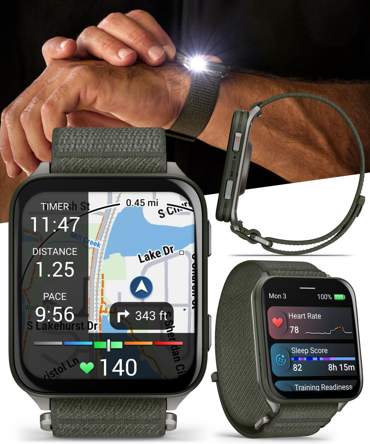 Sleek GPS smartwatch with our biggest display — 2” easy-to-read AMOLED — and our thinnest watch case measuring 8 mm with a scratch-resistant sapphire lens, titanium caseback, bright LED flashlight and ComfortFit nylon band for all-day wearability