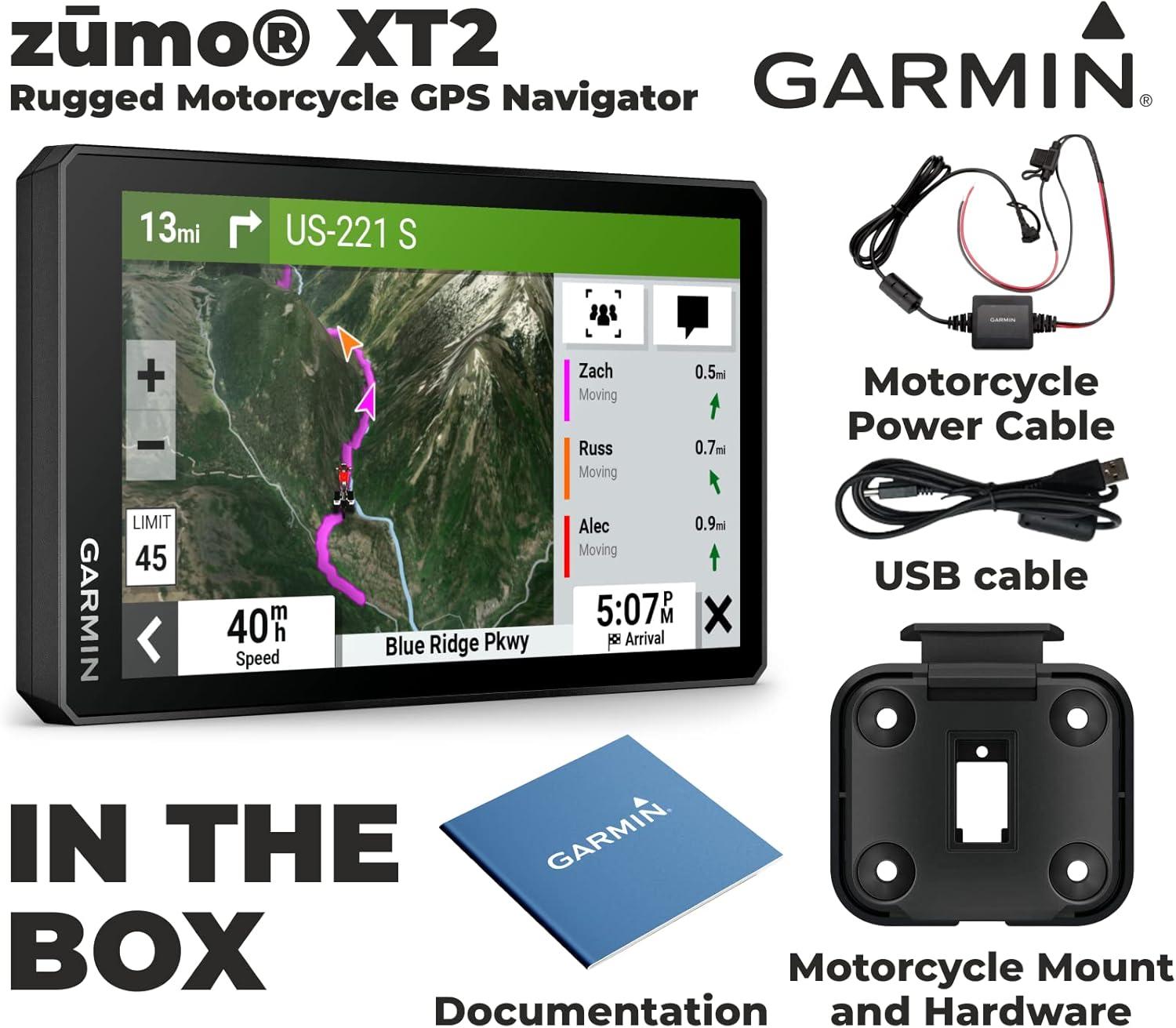 IN THE BOX: 1x Garmin zumo XT2, 1x motorcycle mount and hardware, 1x motorcycle power cable, 1x USB cable, 1x Wearable4U E-Bank, 1x Car Charger, 1x Wall Charger, 1x microUSB cable