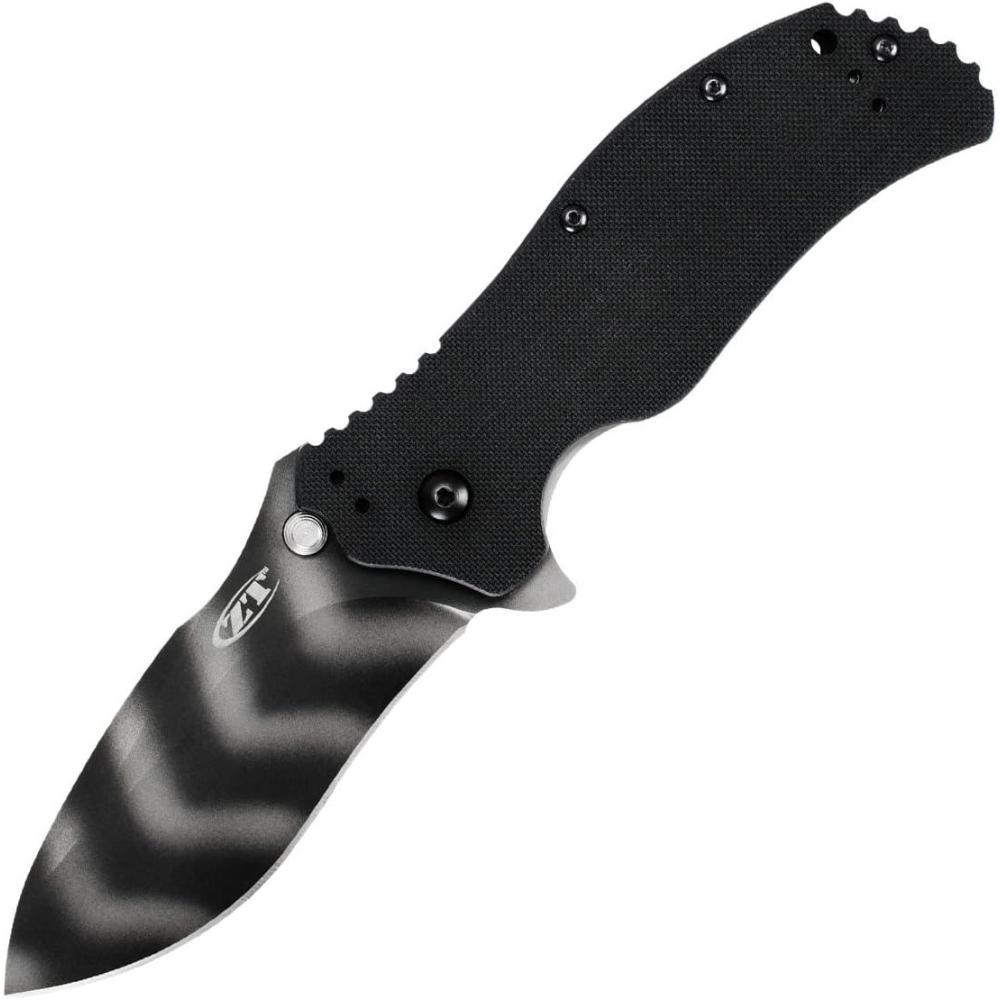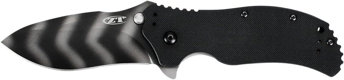 Tiger-striped Tungsten DLC (Diamond-Like Carbon) blade coating and textured black G-10 handles cleanly pair together to make a wild, aggressive knife